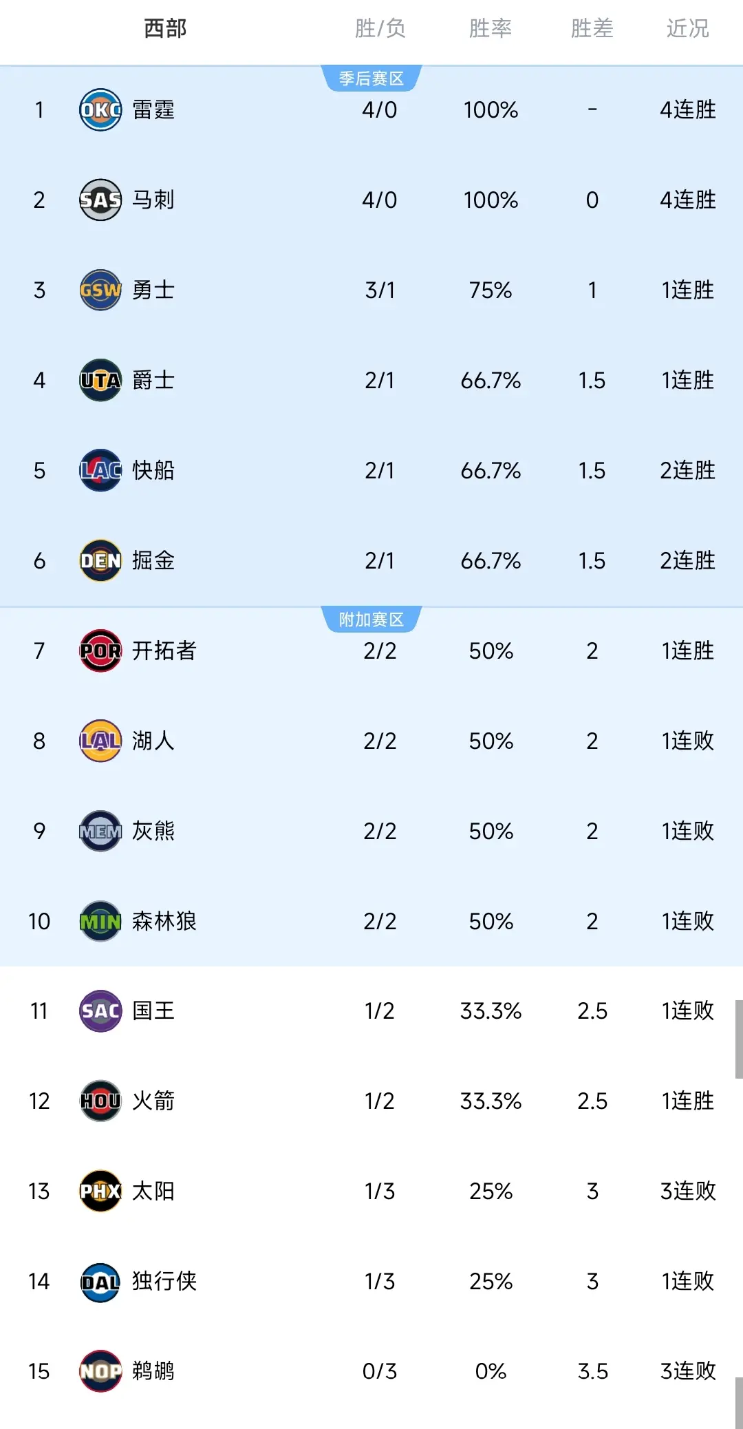 雷霆和马刺继续保持全胜的战绩,NBA西部最新排名如下,勇士暂列第三,湖人掉出前六的位置。